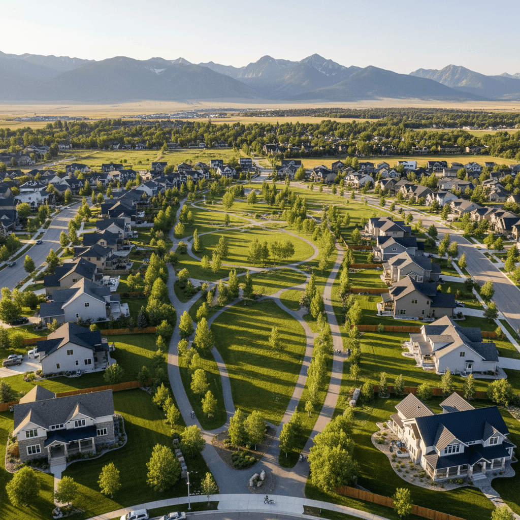 Showcase properties and lifestyle in Baxter Meadows Bozeman with professional aerial videography. Our drone services capture the large central park, extensive trails, and diverse architectural styles that defines this unique Bozeman neighborhood. Perfect for real estate listings, community marketing, and showcasing the specific character of Central Park Community living in Gallatin County.