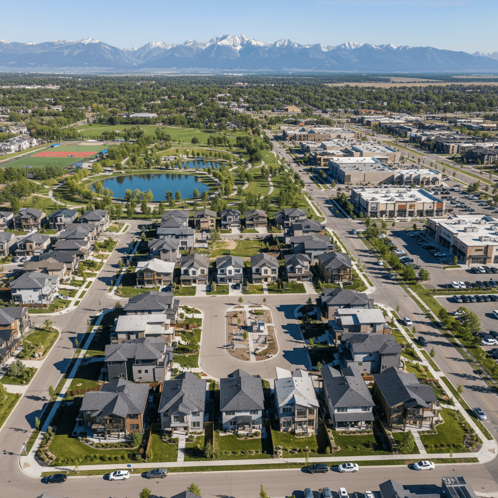 Showcase properties and lifestyle in The Crossing Bozeman with professional aerial videography. Our drone services capture the contemporary homes, 100-acre park proximity, and shopping access that defines this unique Bozeman neighborhood. Perfect for real estate listings, community marketing, and showcasing the specific character of Modern Development living in Gallatin County.