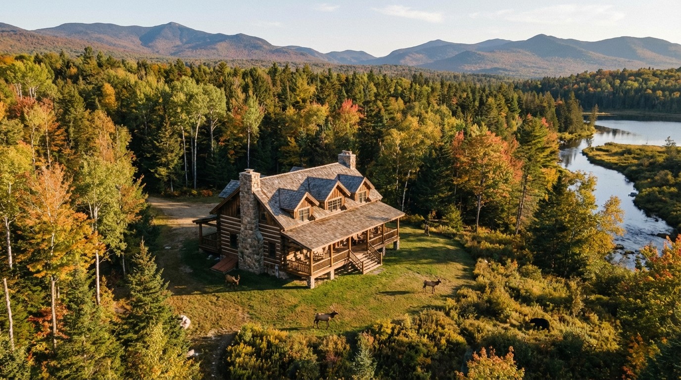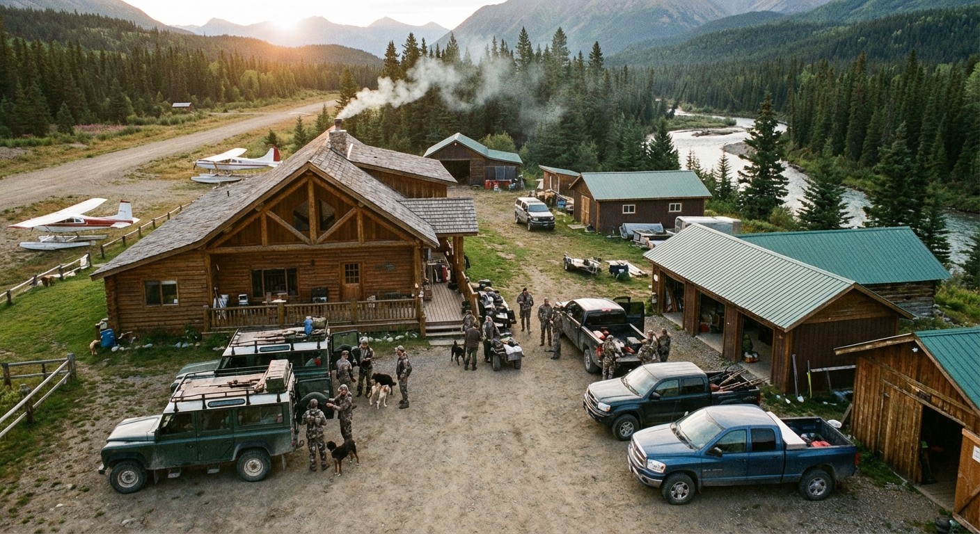 Aerial footage reveals the lodge's remote location, surrounding wilderness, and exclusive access to prime hunting territory.