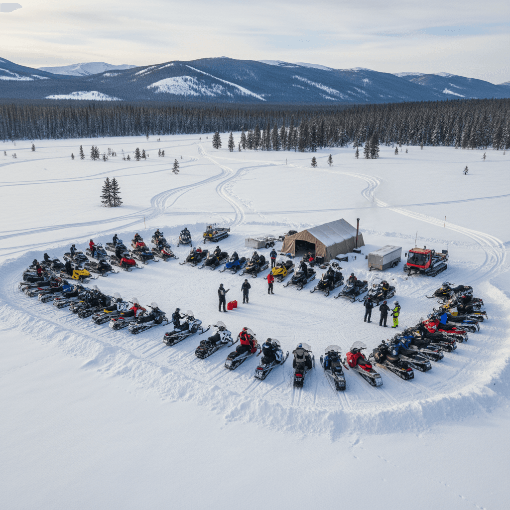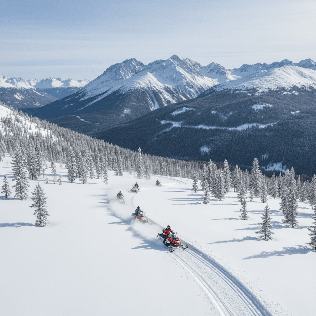 Aerial footage reveals groomed trails, scenic viewpoints, and the vast backcountry accessible by snowmobile.